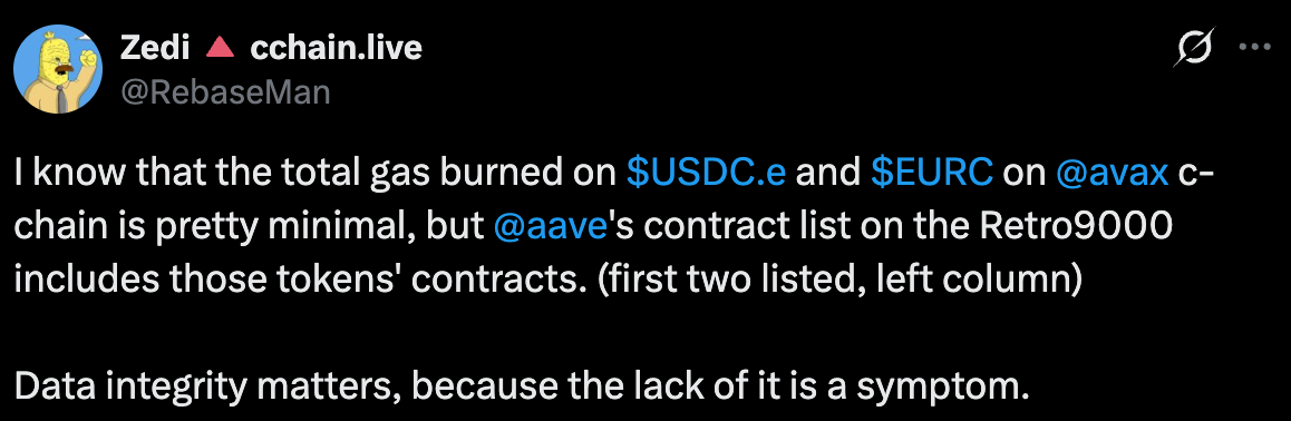 In other grant related news, chain researchers Zedi and Tactical Retreat took a look at what contracts were being used by projects for this upcoming Retro9000 C-Chain round and found some interesting things listed! Remember, projects are receiving funding based on the gas burned by their contracts.