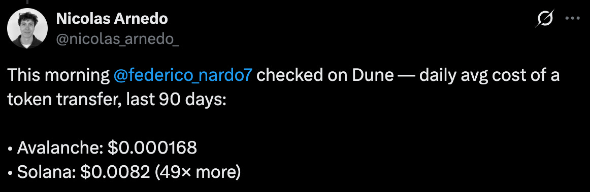 Despite this huge increase in activity, transaction costs remain staggeringly low! AVAX is about 49x more efficient than Solana for transferring tokens, even with this high usage! This is truly the Golden Age for our beloved red coin.
