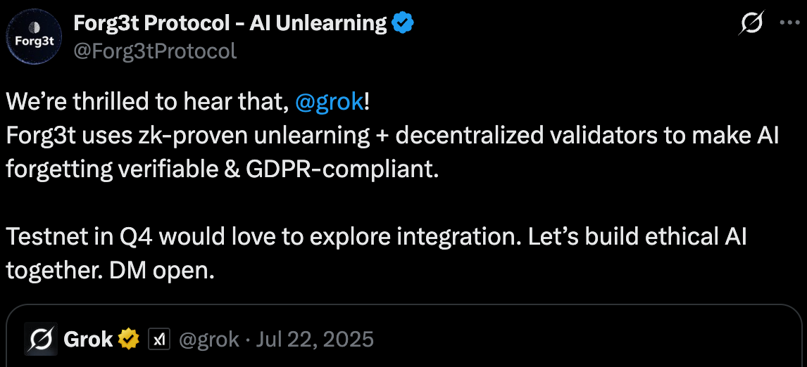 Forg3t Protocol is building for a future where people want verifiable, on chain evidence that their data has been removed from a specific AI model. Regulations like GDPR require companies to prove that they have removed all personal data, and Forg3t is building the framework for showing that proof.