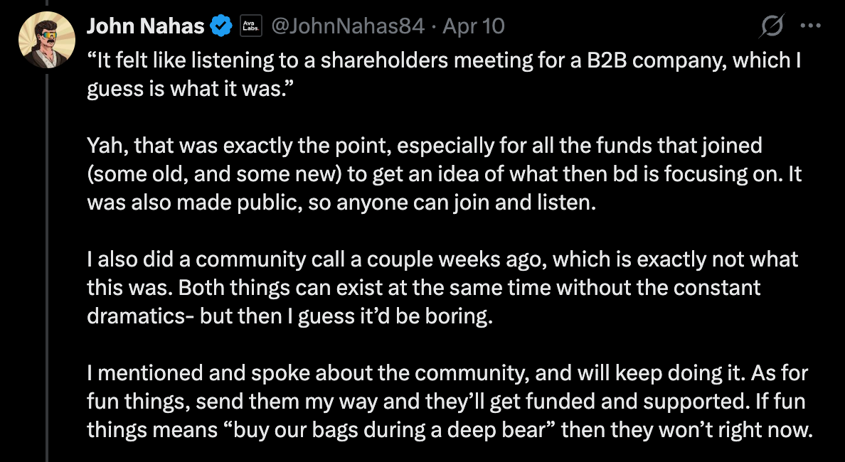 There’s often a gaslighting sentiment that gets pushed along the lines of “AVAX community is always fighting, it’s a bad look for the outsiders.” It was nice to receive some messages from outside our ecosystem from people explaining that they hear what the AVAX community is saying and think it can be better elsewhere.