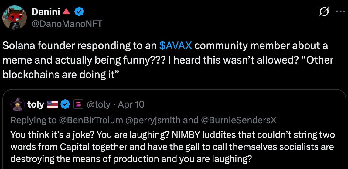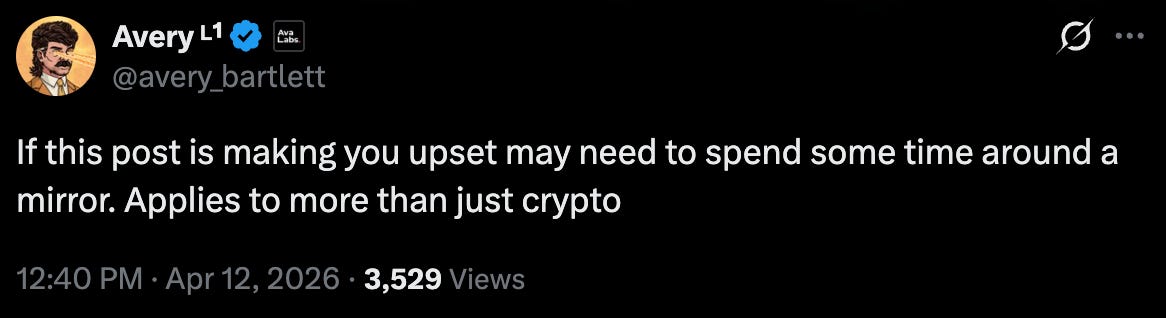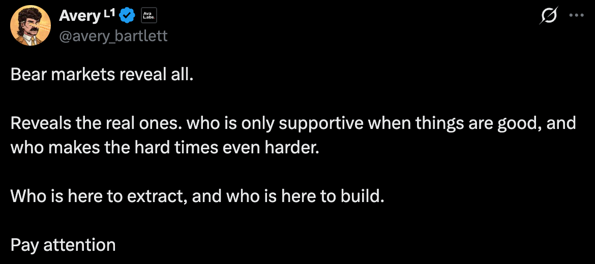 What a tweet from Avery, AVAX’s chief emploid. I want to start off by saying that maybe there is a world where this was an innocent fluff tweet about building through the bear. That’s something many people will post about, and is not necessarily targeted or negative.