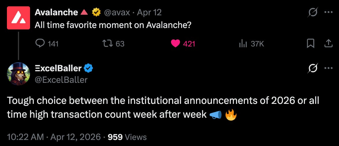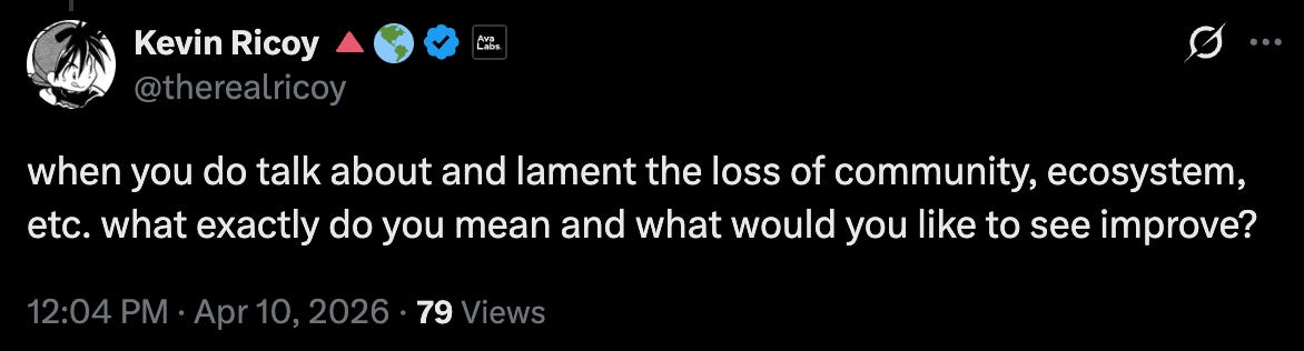 No! I’m not! This is what a “Head of Ecosystem” does on other chains. Can you picture having an ecosystem call on AVAX where they were discussing how to reward communities in 2026? Hard to imagine.