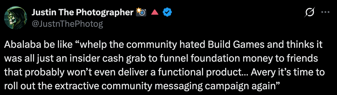 I think this is the core of why people were unhappy with the results of Build Games. It seemed like it could have been a program to spark lots of cool projects on chain (ponzis even!), beefing up the “reward” side of building and giving people more freedom to experiment.