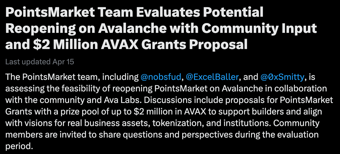 The current issue with building things on AVAX is that there is just very little reward. The community is so small and hesitant right now, so the upside is extremely capped. Especially for something like PointsMarket, which was never monetized to begin with.